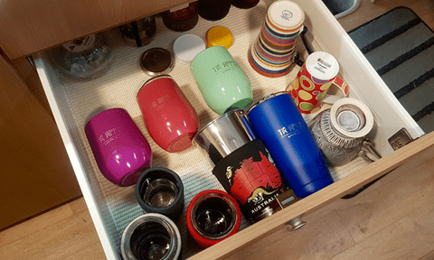 When organizing your caravan and finding ideal spots for items like plates, utensils, and cups, a useful tip is to keep your cups in a drawer. By dedicating a drawer to cups, you’ll be able to store them for easy access.